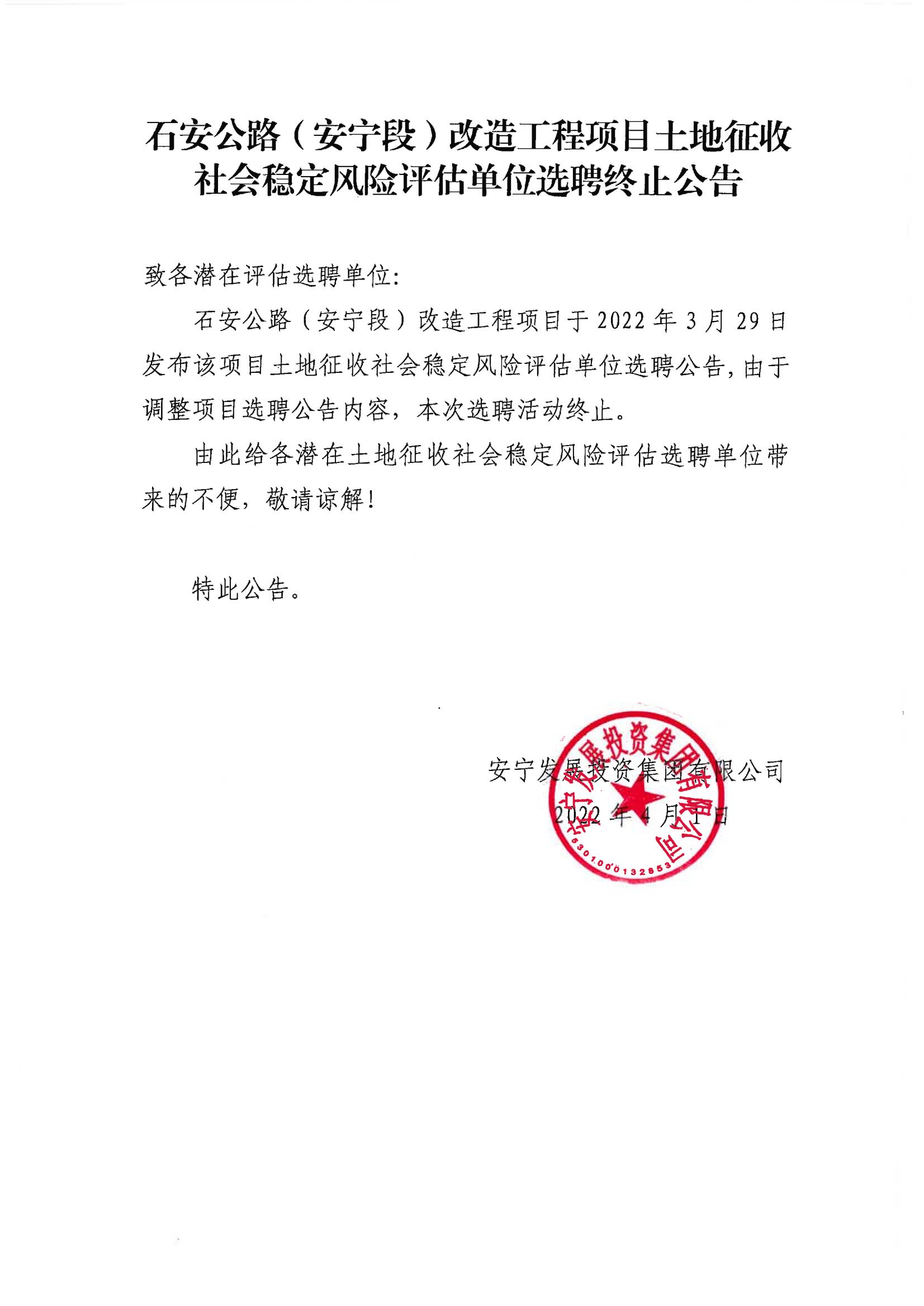 石安公路(安寧段)改造工程項目于2022年3月29日發(fā)布該項目土地征收社會穩(wěn)定風(fēng)險評估單位選聘公告,由于調(diào)整項目選聘公告內(nèi)容,本次選聘活動終止。